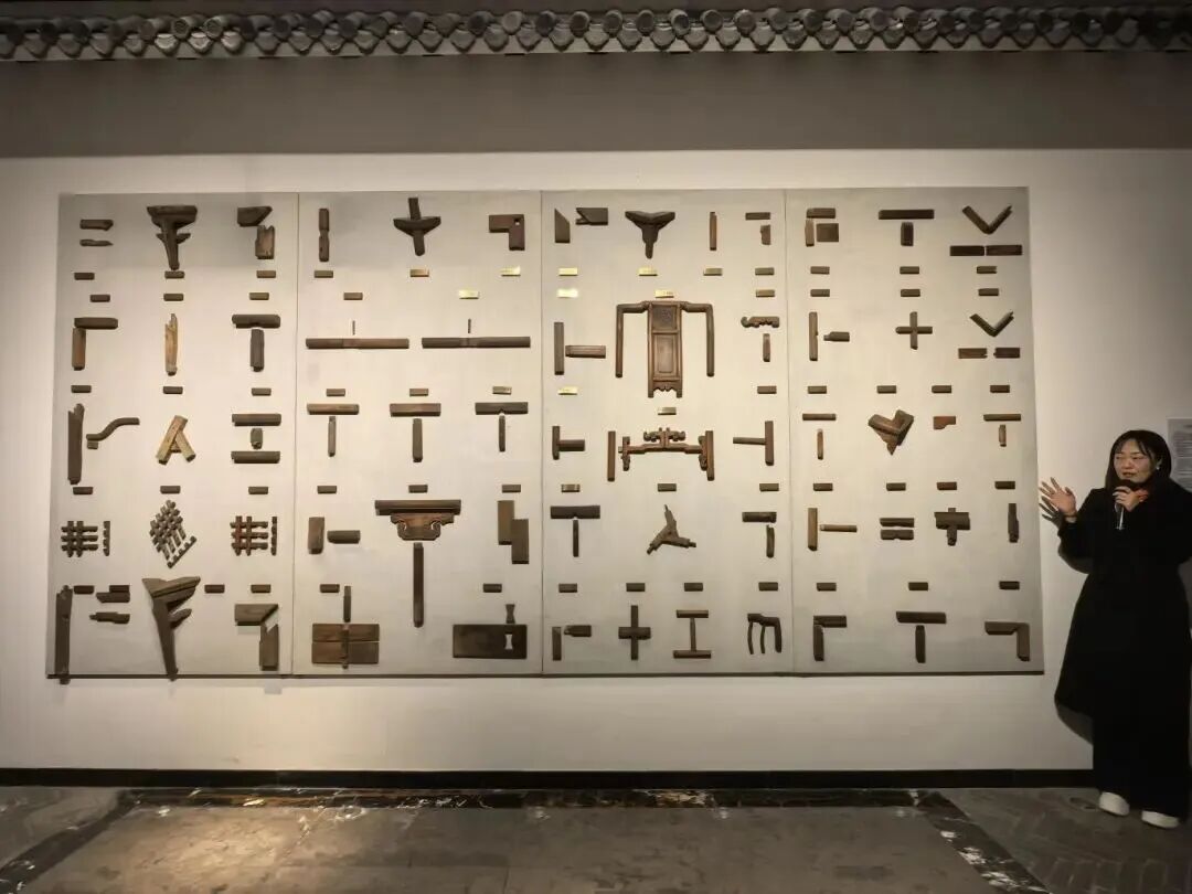 随着参观深入,讲解员为大家介绍中式家具工艺的核心——榫卯结构,这一古老技艺的应用早已渗透生活与建筑:故宫斗拱的精巧、祈年殿的恢弘、应县木塔的千年屹立,还有风雨桥、吊脚楼的灵动身姿,以及各种红木家具皆离不开榫卯的支撑。黑酸枝罗汉床堪称“木作艺术的传世孤品”,作为工厂最资深老师傅的“封刀之作”,圆雕龙头的灵动、透雕龙鳞的精巧、祥云纹的雅致与活珠龙珠的鲜活融为一体,一雕一琢皆见真章;最难得的是床体背板为一整块完整独板,原树需历经千年风雨生长、直径达1.2米方可取材,静静诉说着东方木作的千年传承。