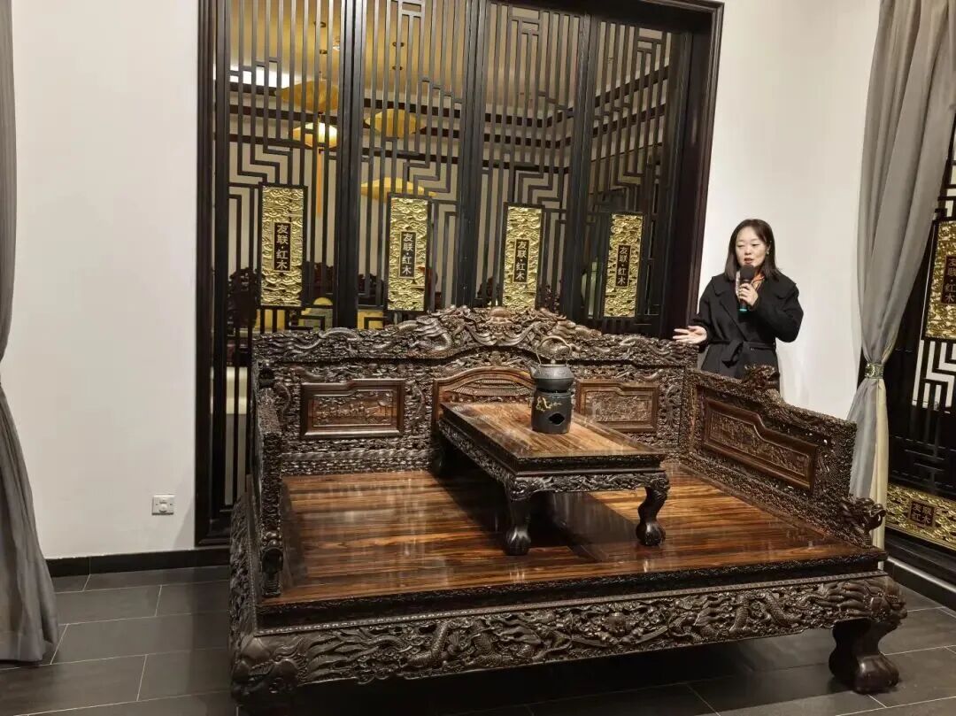 随着参观深入,讲解员为大家介绍中式家具工艺的核心——榫卯结构,这一古老技艺的应用早已渗透生活与建筑:故宫斗拱的精巧、祈年殿的恢弘、应县木塔的千年屹立,还有风雨桥、吊脚楼的灵动身姿,以及各种红木家具皆离不开榫卯的支撑。黑酸枝罗汉床堪称“木作艺术的传世孤品”,作为工厂最资深老师傅的“封刀之作”,圆雕龙头的灵动、透雕龙鳞的精巧、祥云纹的雅致与活珠龙珠的鲜活融为一体,一雕一琢皆见真章;最难得的是床体背板为一整块完整独板,原树需历经千年风雨生长、直径达1.2米方可取材,静静诉说着东方木作的千年传承。
