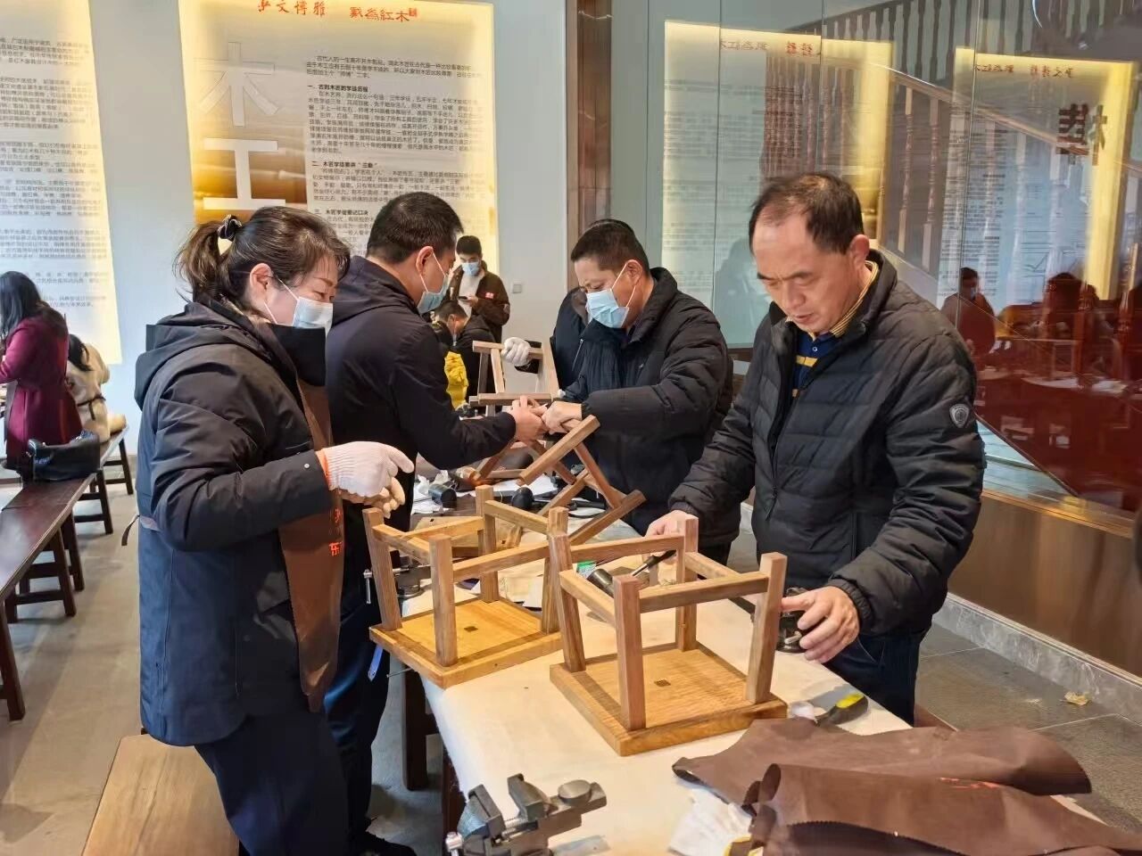 参观结束后,统战成员们汇聚非遗体验区,在木作老师的指导下,成员们亲手体验榫卯结构的拼接魅力。无需一钉一铆,仅通过凸榫与凹卯的精准契合,便能将零散的木件组装成稳固的小方凳。大家专注于打磨、对齐、拼接,在反复调试中体会到“差之毫厘,谬以千里”的匠人精神,更理解了榫卯工艺为何能成为中国传统家具“经久耐用”的核心秘诀。